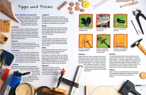 Woher bekommen ich Holz für mein Bastelprojekt? Welche Werkzeuge sind am besten geeignet? Antworten darauf und 150 kreative Ideen liefert das Buch von Sabine Loof. Borkenkrokodile, Leisten-Labyrinthe, Kochlöffel-Theater, Eisstiel-Sterne, Obstkisten-Züge und vieles mehr. Hier wird gesägt, gehämmert und gebohrt, aber auch gemalt, geklebt und ganz viel gespielt. • aus dem Gerstenberg Verlag
