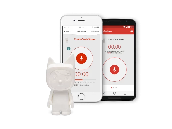 Mit der dazugehörigen, kostenlosen Smartphone-App können eigene Sprachaufnahmen aufgezeichnet und dem Kreativ-Tonie zugewiesen werden.